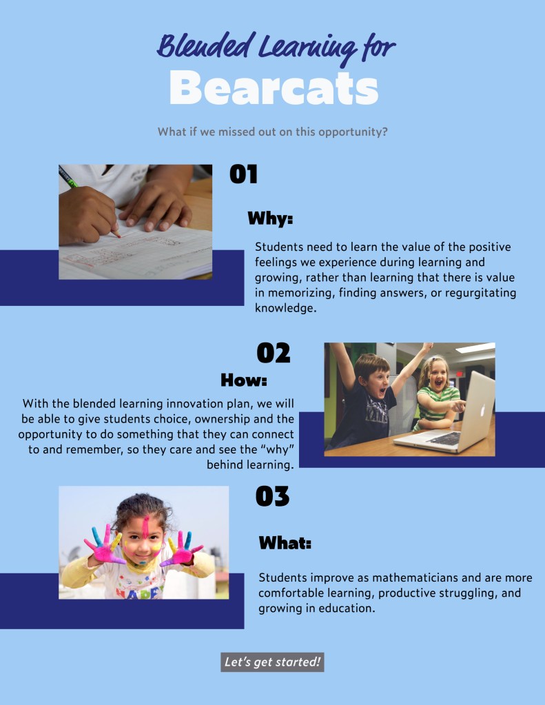 With my blended learning innovation, I will be able to give students choice, ownership and the opportunity to do something that they can connect to and remember, so they care and see the “why” behind mathematics.