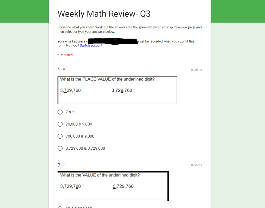 If you want to take a grade on it, you’ll need to assign point values. I solely was looking at the wonderful analytics Google Forms creates for you under the creator tab called “responses” I am able to see exactly who missed what questions and what common mistakes were.